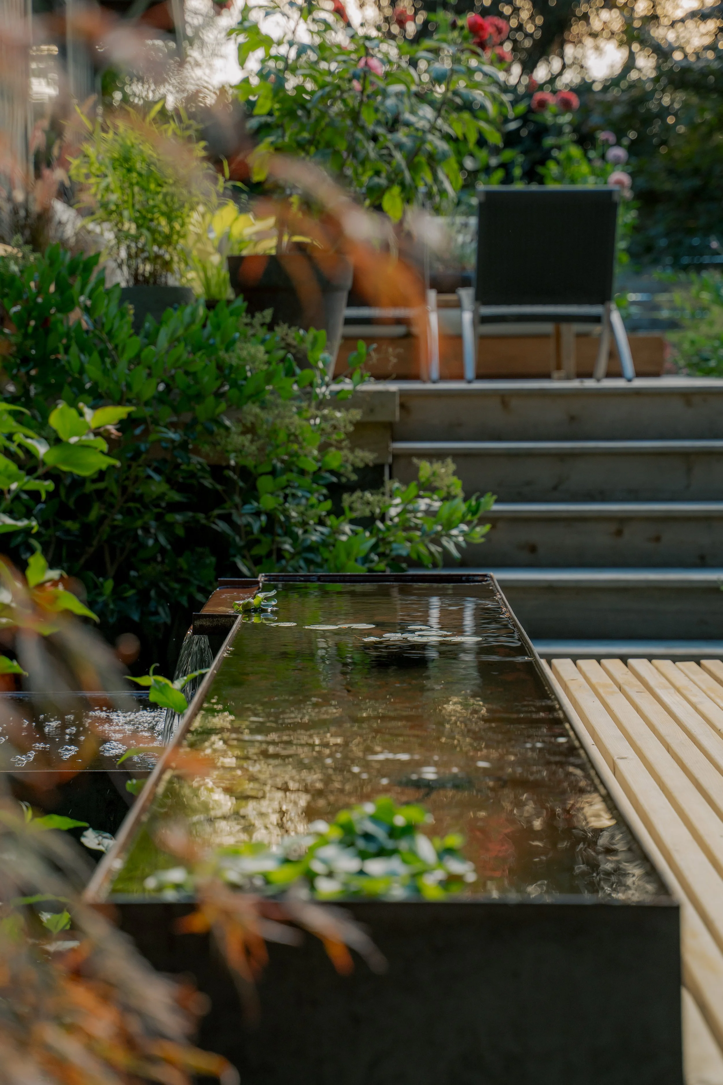 Located in North Saanich, this peaceful garden sanctuary reflects a deep commitment to beauty, craft, and quiet living. The landscape has been shaped to feel both intentional and effortless, inviting visitors to slow down the moment they step onto the property. Modern concrete slabs weave gently through soft, billowing plantings, creating a graceful rhythm across the garden and guiding movement toward a low deck that extends the home’s kitchen and living spaces into the outdoors. At the heart of the garden, a corten steel water feature with a built-in bench provides a serene place to pause. The gentle sound of water and the warmth of the metal offer an inviting nook for morning tea or a reflective moment throughout the day. Nearby, a cedar hot tub and fire pit rest beneath the canopy of a wise old cedar tree — a sheltered, year-round gathering place where family and friends can connect in comfort. Cedar fencing paired with stands of bamboo encloses the lawn and play space with a sense of privacy and gentle enclosure, giving the garden its own distinct sense of retreat. Throughout the planting beds, dahlias rise tall and radiant, a joyful nod to the client’s care and personal touch. Their vivid colours animate the space, while the family’s chickens roam freely through the woodland edges, completing the feeling of a lived-in, peaceful haven where nature and daily life blend seamlessly.